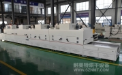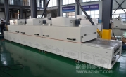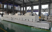 2、外形尺寸(約):總長8000*高1600*寬1200mm,進(jìn)料部分長1000mm,加熱部分長6000mm(分3段溫區(qū)),收料部分長1000mm。輸送帶離地高700mm;